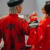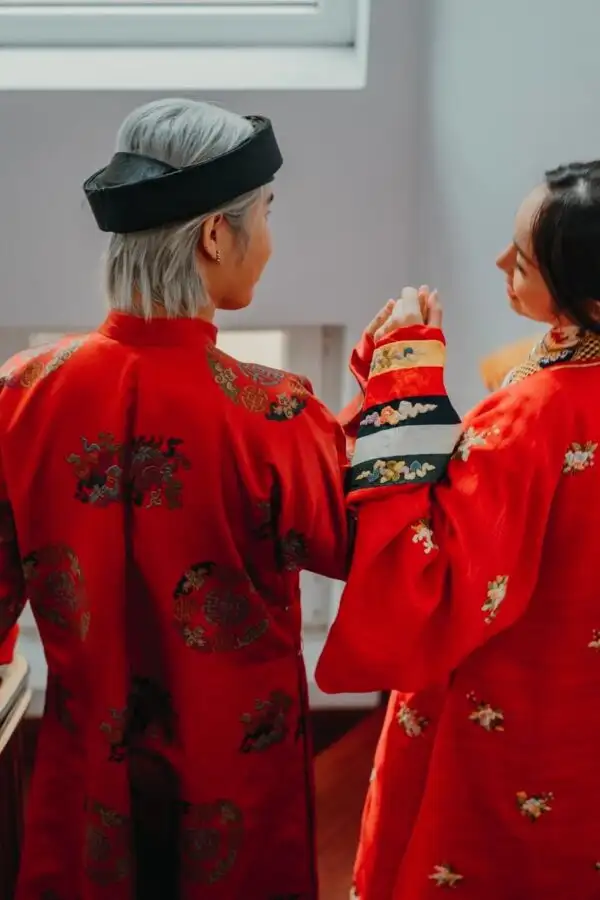 – Áo Táo Ngũ thân tay chẽn vải tafta in hoa văn chìm nền đỏ đô