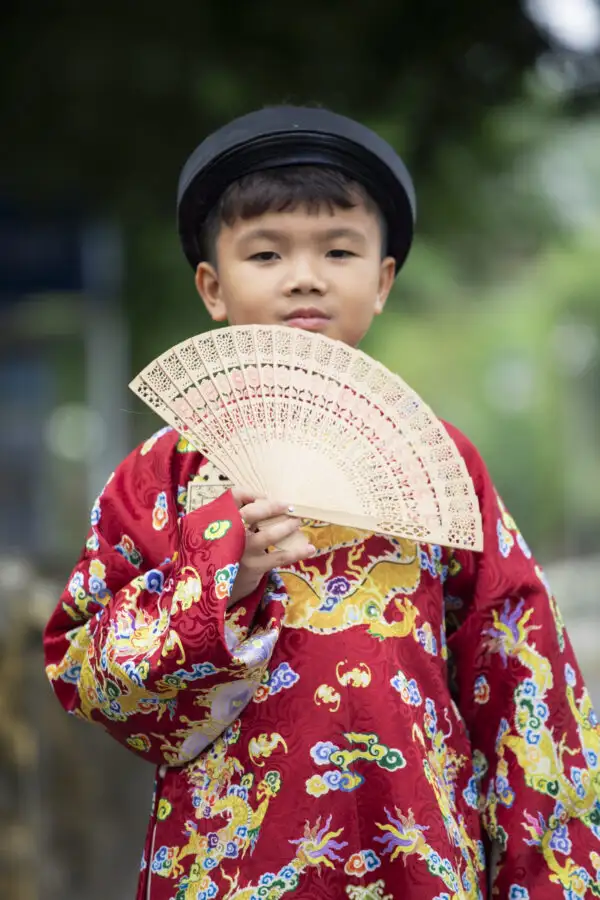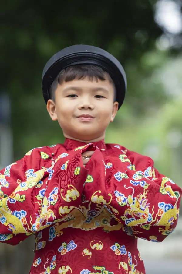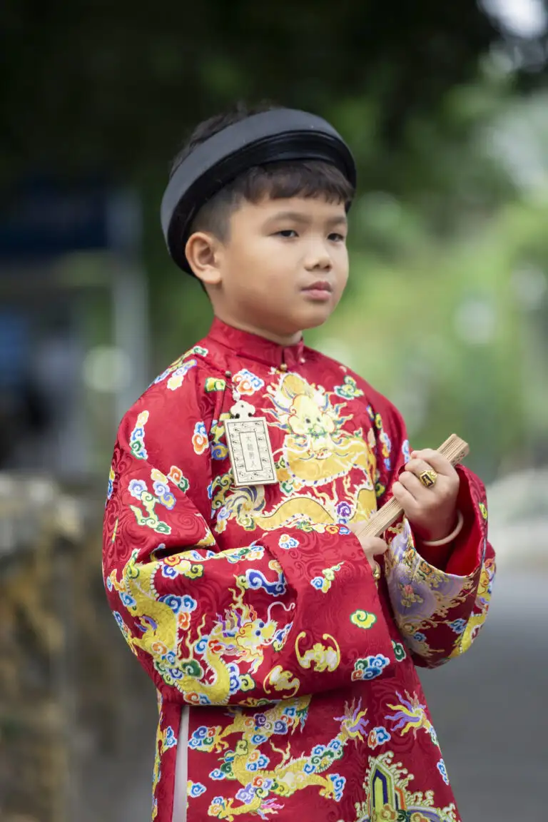 – Áo Tấc hoa văn Mãng Lan màu đỏ, cho bé trai