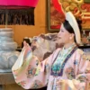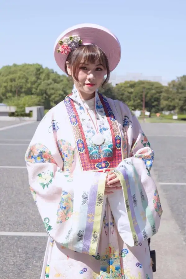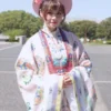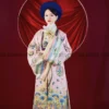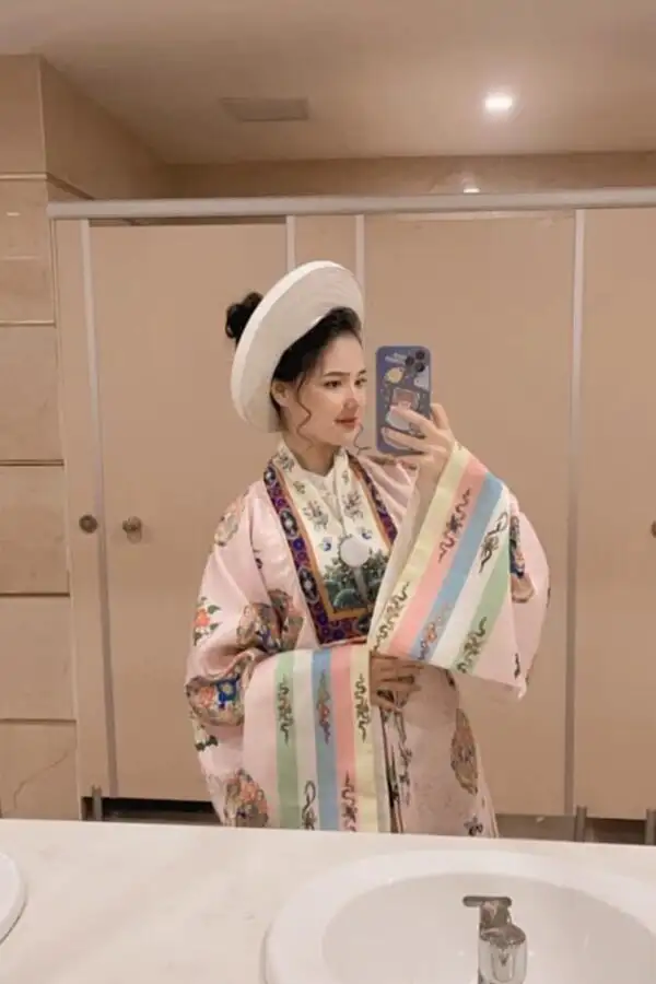 – Áo Nhật Bình hồng pastel vải gấm in hoa văn chìm