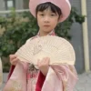 – Áo Nhật Bình trẻ em màu hồng vải gấm in hoa văn Thỏ Ngọc chìm