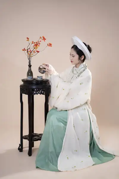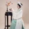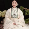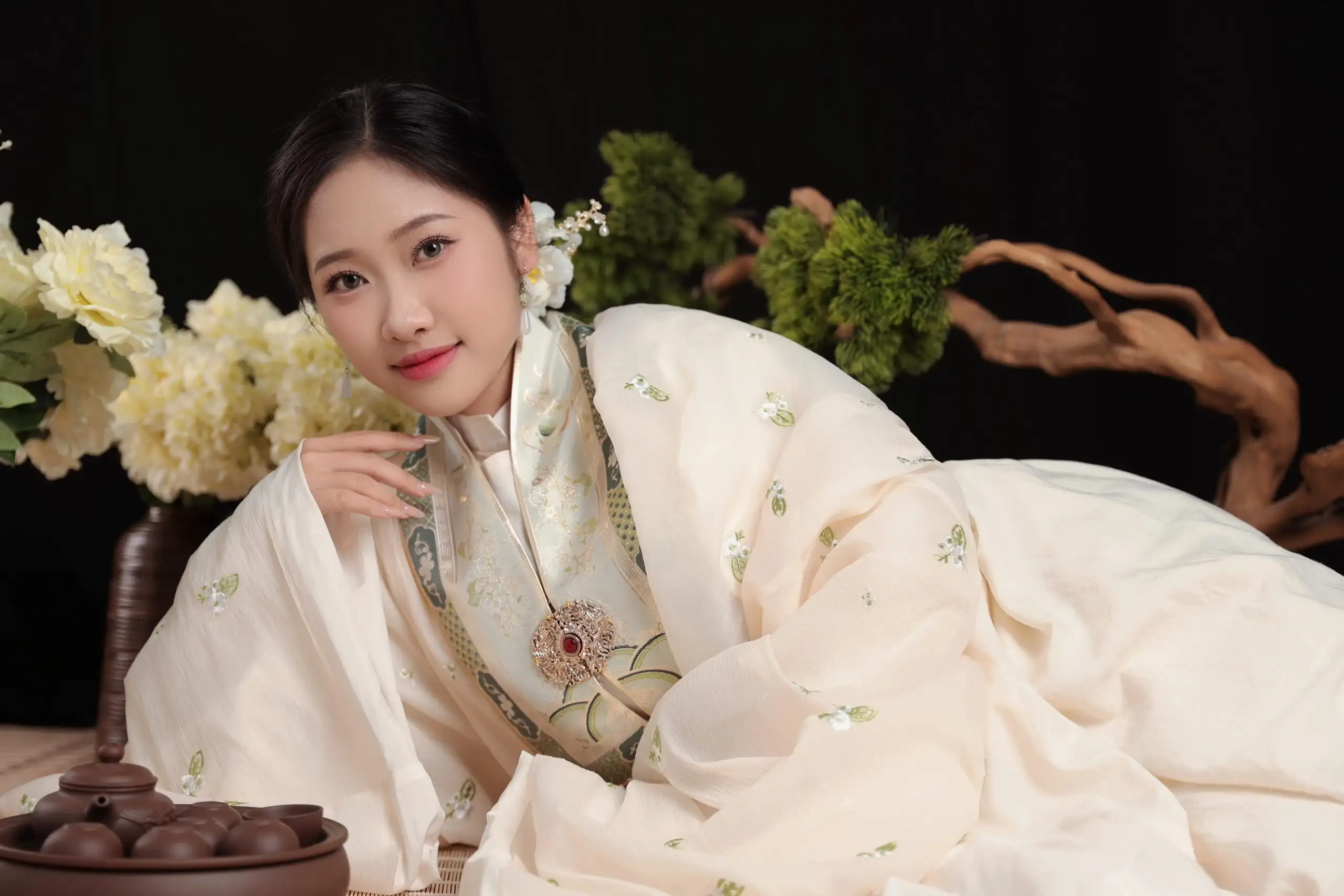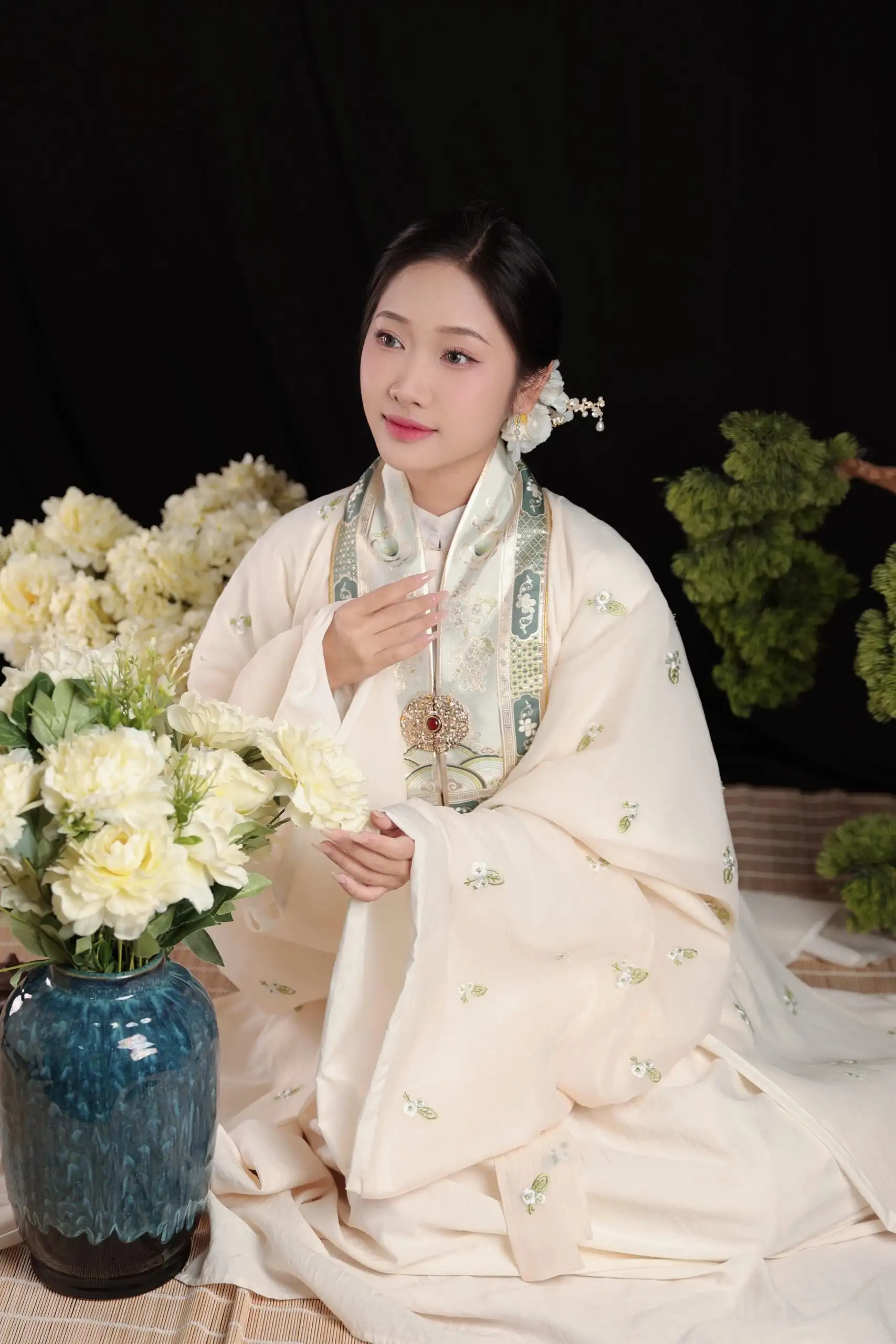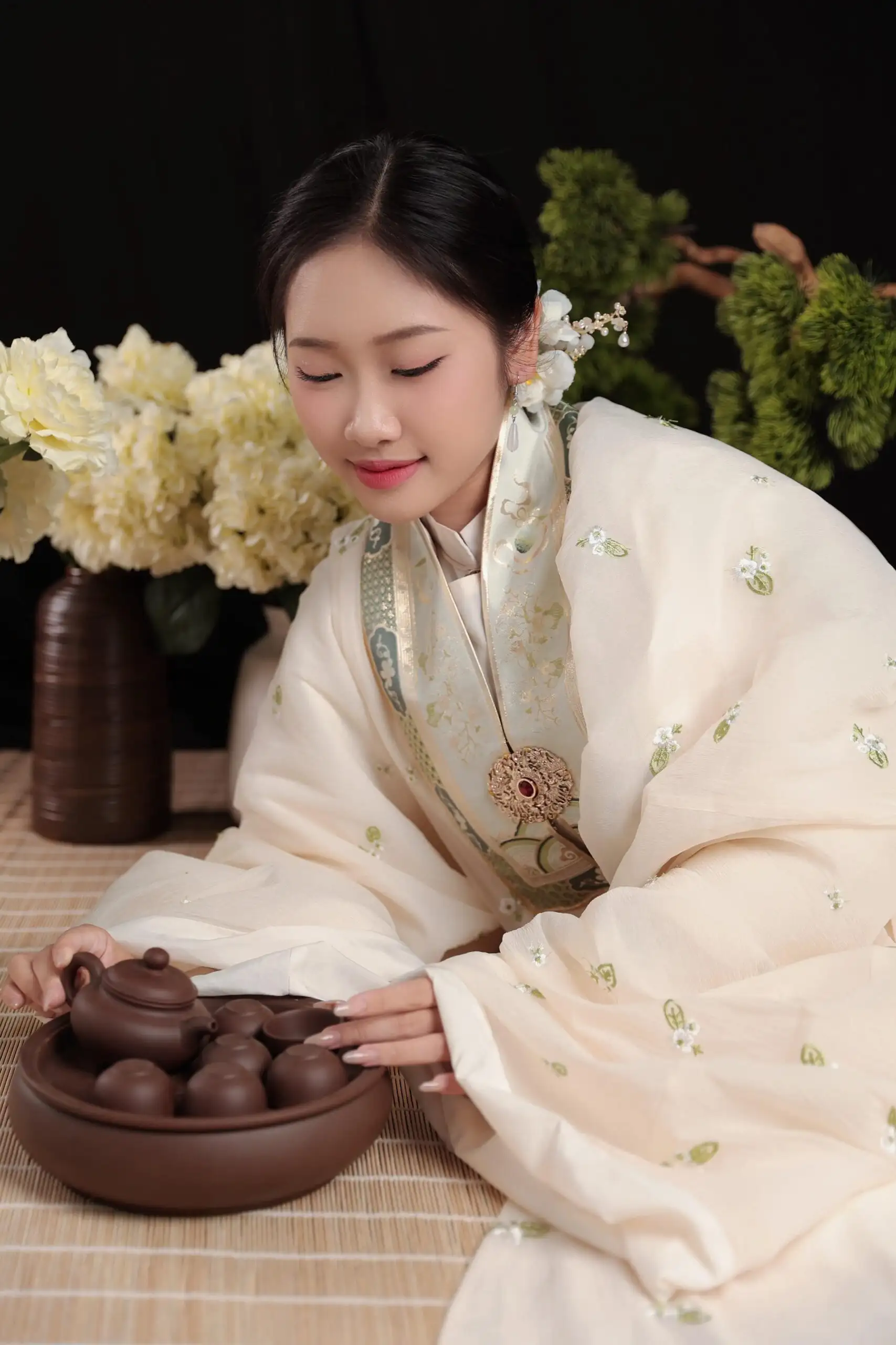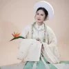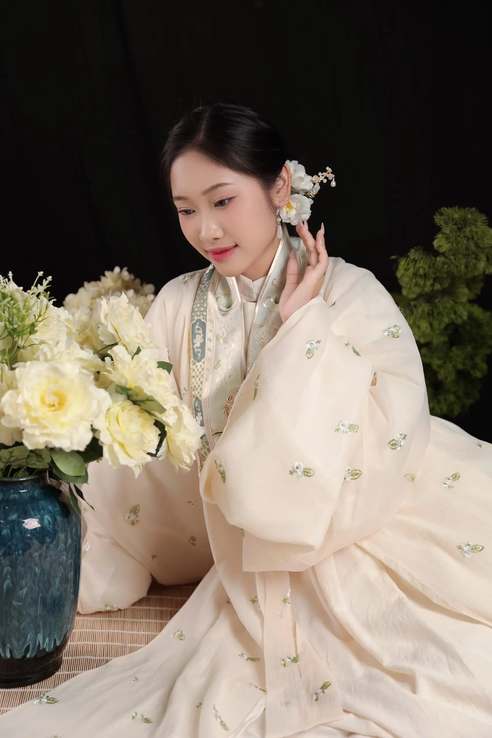 – Áo Nhật bình cổ dệt hương bưởi be thêu hoa nhí trắng
